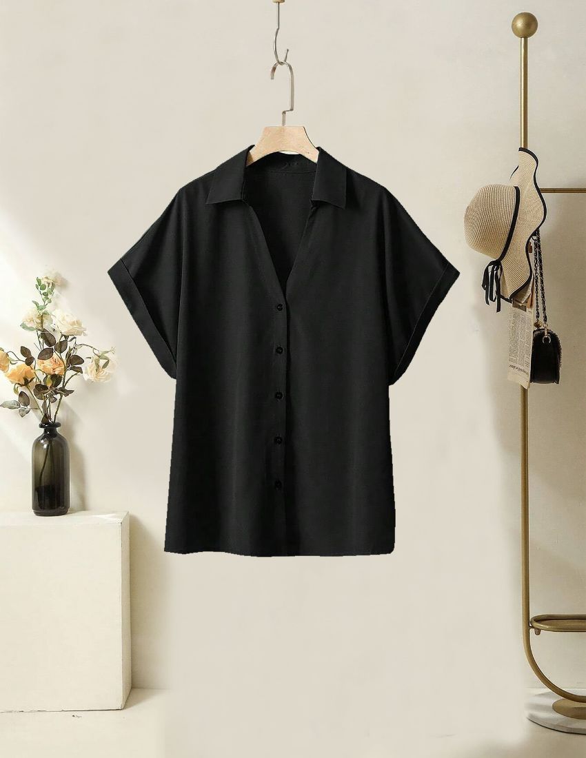 This elegant black short-sleeve button-up shirt is a must-have wardrobe staple. With a relaxed fit, lightweight fabric, and a sophisticated collar, it’s perfect for any occasion—whether dressed up for a sleek evening look or styled casually for everyday wear. A timeless piece that complements any outfit effortlessly!