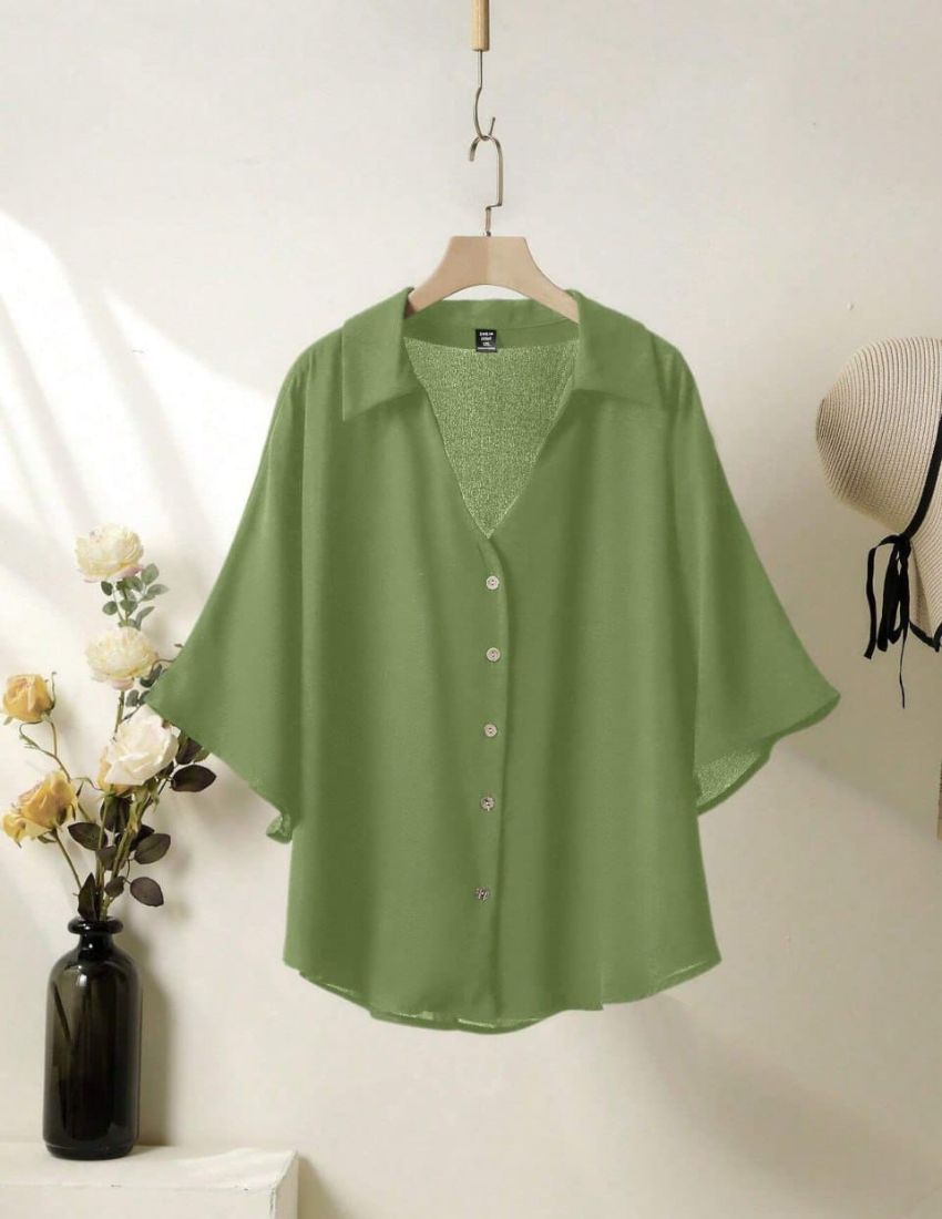 The design features a wide V-neck collar and short sleeves, giving it an airy and relaxed look. flowy sleeves and relaxed fit. The overall aesthetic is minimal and casual, suitable for everyday wear or a comfortable, laid-back outing.